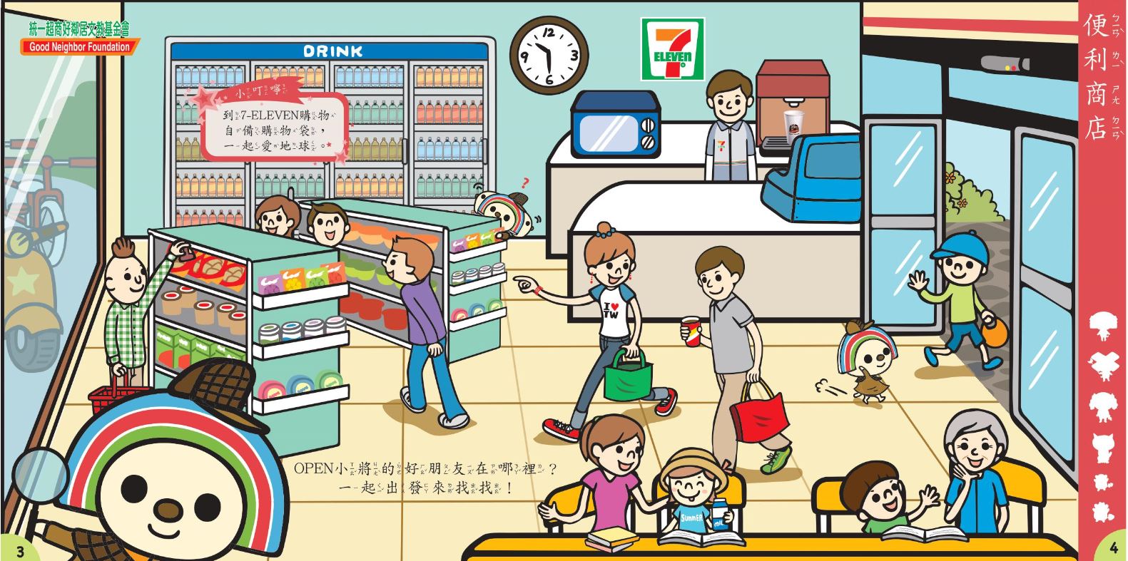 超人氣的OPEN小將,是許多大小朋友的最愛,同時也是7-ELEVEN的吉祥物!這次,OPEN小將與好朋友們來到不同的地點出任務,邀請各位小朋友一起找找「OPEN!好朋友在哪裡?」在繪本中,小朋友將能學習到數數、分類、推理跟比較唷!