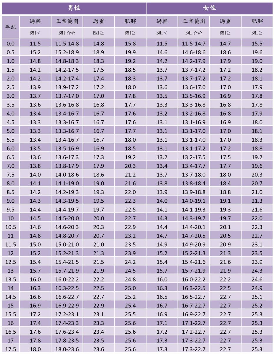 依照國民健康署資料成人身體質量指數(BMI)理想範圍為18.5~23.9最佳。但孩童因為還在成長階段,所以各年齡層BMI的理想範圍並不相同,如:10歲男學童其BMI正常範圍為14.5-20。(表一)