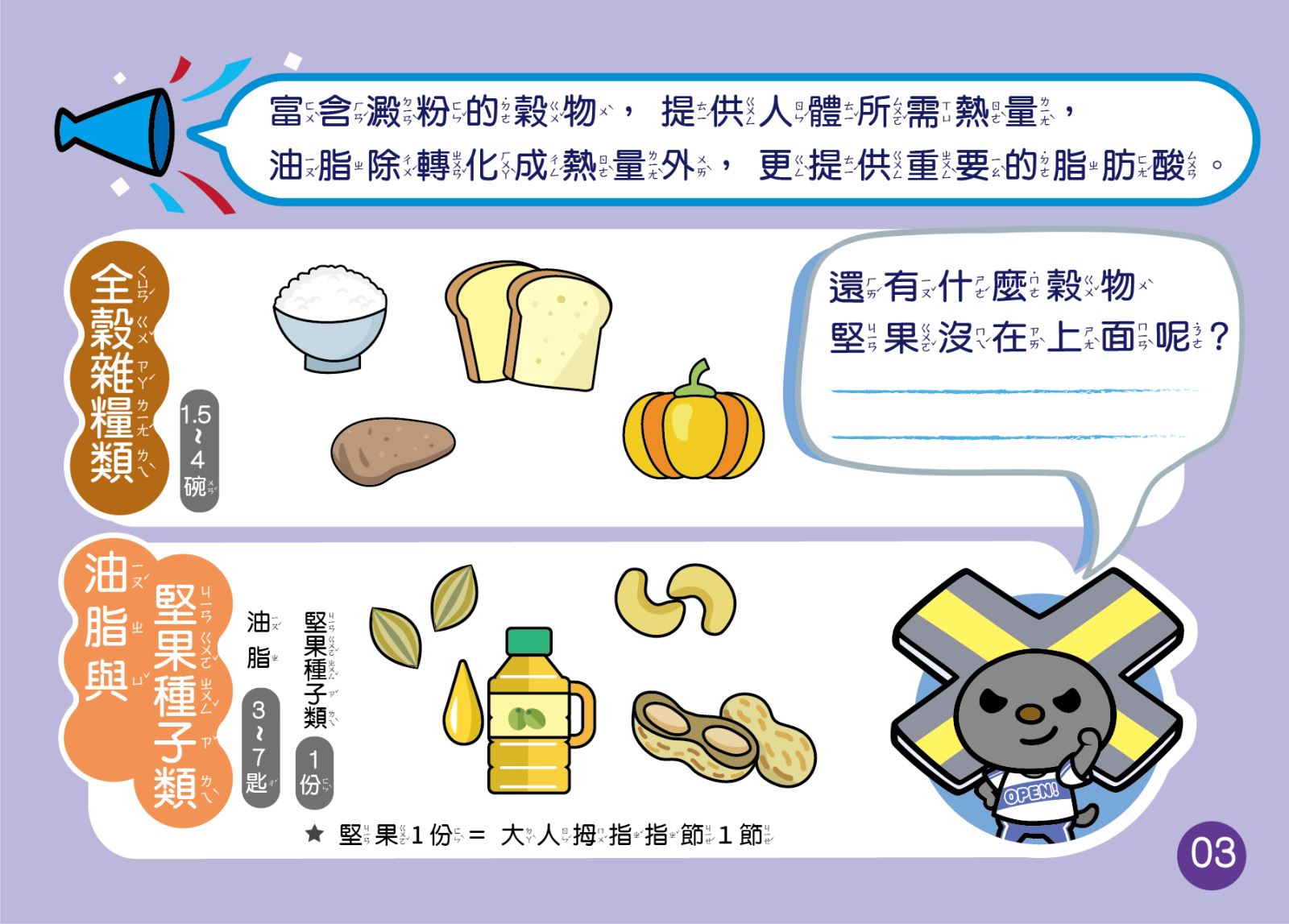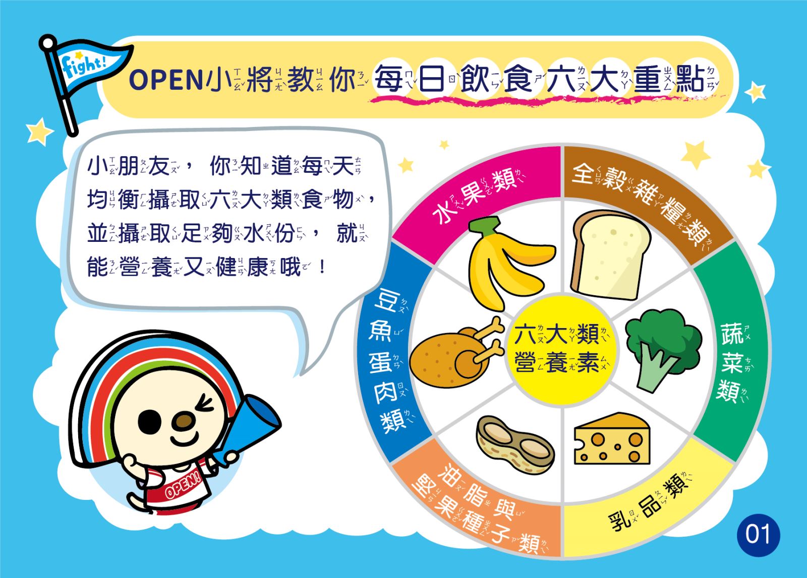 OPEN小將教你每日飲食六大重點,每天均衡攝取六大類食物,並攝取足夠水分,就能營養又健康喔!