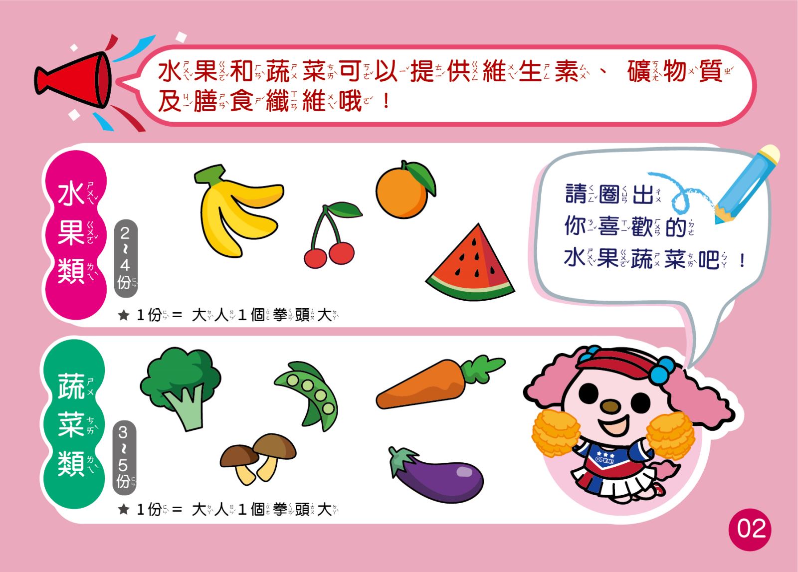 2.蔬菜與水果類:五彩蔬果功效不一樣,色彩繽紛營養足。